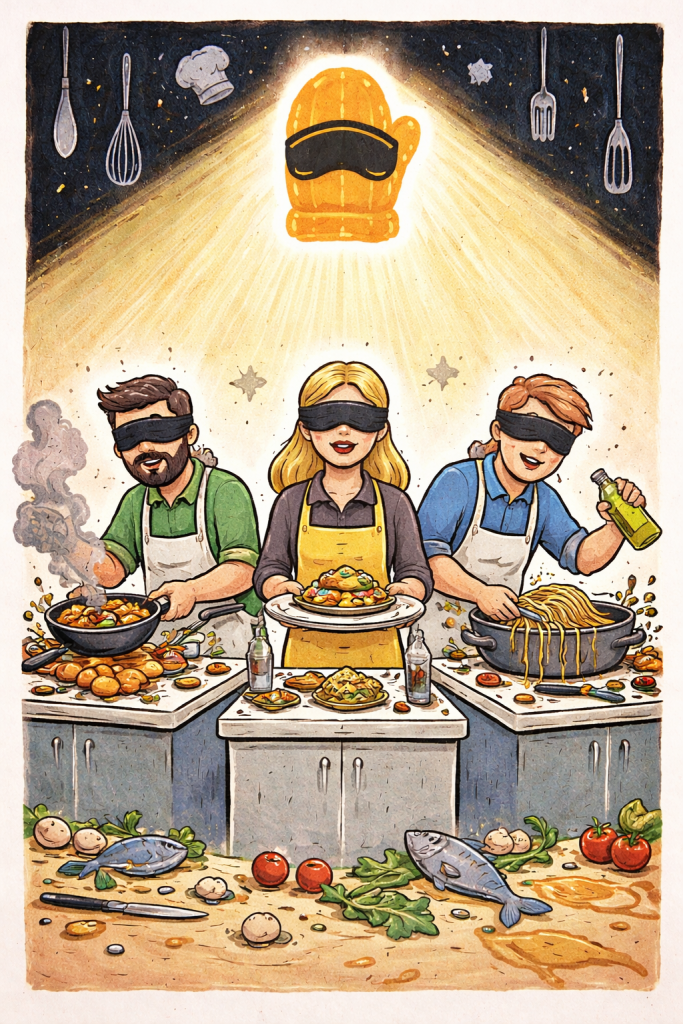 Sketch – L’Oven Blind – Comedy – Three contestants compete on the new “Cooking in the Dark” competition show, L’Oven Blind to varying degrees of success.